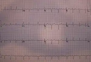 The cause is often unknown.[4] Risk factors include COPD, pulmonary hypertension, heart failure, and endurance sports.[2][4] Triggers can include electrolyte abnormalities, high thyroid, or low oxygen.[2] It is a type of supraventricular tachycardia.[3] Diagnosis is generally by an electrocardiogram (ECG) showing a flutter wave at 300 beats per minute with narrow QRS complexes every 2nd beat.[2][3] If the diagnosis is unclear, giving adenosine may help clarify the condition.[3] It may also convert into atrial fibrillation (AF).[4]