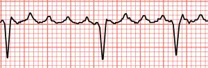 The impact and symptoms of atrial flutter depend on the heart rate of the affected person. Heart rate is a measure of the ventricular rather than atrial activity. Impulses from the atria are conducted to the ventricles through the atrio-ventricular node (AV node). In a person with atrial flutter, a 12-lead electrocardiogram (ECG) will demonstrate the atrial chambers of the heart contracting at a rate of 280–300 beats per minute whereas the ventricular chambers of the heart typically beat at a rate of 140–150 beats per minute.[3] Due primarily to its longer refractory period, the AV node exerts a protective effect on heart rate by blocking atrial impulses in excess of about 180 beats/minute, for the example of a resting heart rate. (This block is dependent on the age of the patient, and can be calculated roughly by subtracting patient age from 220). If the flutter rate is 300/minute only half of these impulses will be conducted, giving a ventricular rate of 150/minute, or a 2:1 heart block. The addition of rate-controlling drugs or conduction system disease can increase this block substantially (see image below).