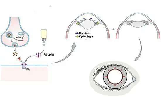 In the eye, atropine induces mydriasis by blocking contraction of the circular pupillary sphincter muscle, which is normally stimulated by acetylcholine release, thereby allowing the radial iris dilator muscle to contract and dilate the pupil. Atropine induces cycloplegia by paralyzing the ciliary muscles, whose action inhibits accommodation to allow accurate refraction in children, helps to relieve pain associated with iridocyclitis, and treats ciliary block (malignant) glaucoma.