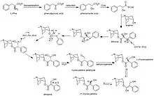 The biosynthesis of atropine starting from l-phenylalanine first undergoes a transamination forming phenylpyruvic acid which is then reduced to phenyl-lactic acid.[43] Coenzyme A then couples phenyl-lactic acid with tropine forming littorine, which then undergoes a radical rearrangement initiated with a P450 enzyme forming hyoscyamine aldehyde.[43] A dehydrogenase then reduces the aldehyde to a primary alcohol making (−)-hyoscyamine, which upon racemization forms atropine.[43]