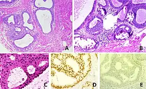 - ↑ Rageth, Christoph J.; Rubenov, Ravit; Bronz, Cristian; Dietrich, Daniel; Tausch, Christoph; Rodewald, Ann-Katrin; Varga, Zsuzsanna (2018). "Atypical ductal hyperplasia and the risk of underestimation: tissue sampling method, multifocality, and associated calcification significantly influence the diagnostic upgrade rate based on subsequent surgical specimens". Breast Cancer. 26 (4): 452–458. doi:10.1007/s12282-018-00943-2. ISSN 1340-6868. PMC 6570781. PMID 30591993. This article is distributed under the terms of the Creative Commons Attribution 4.0 International License (http://creativecommons.org/licenses/by/4.0/)