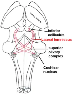 Lateral lemniscus in red, as it connects the cochlear nucleus, superior olivary nucleus and the inferior colliculus, seen from behind