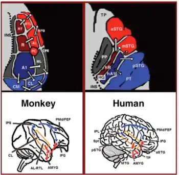 40. Hackett TA, Preuss TM, Kaas JH (December 2001). "Architectonic identification of the core region in auditory cortex of macaques, chimpanzees, and humans". The Journal of Comparative Neurology. 441 (3): 197–222. doi:10.1002/cne.1407. PMID 11745645. S2CID 21776552.