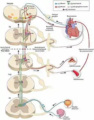 - 1 2 3 4 5 6 7 8 9 10 11 12 13 Eldahan KC, Rabchevsky AG (January 2018). "Autonomic dysreflexia after spinal cord injury: Systemic pathophysiology and methods of management". Autonomic Neuroscience. 209: 59–70. doi:10.1016/j.autneu.2017.05.002. PMC 5677594. PMID 28506502.