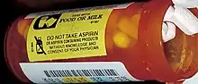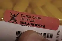 Auxiliary labels are generally small stickers consisting of a pictogram and one or more lines of text intended to enhance patient knowledge. They generally contain information not contained in the "directions" on the prescription label itself. This can include supplementary directions for administration, whether the medication can be chewed, crushed, or cut, and information on side effects or drug/food interactions.[5][6] All auxiliary labels contain information important to proper medication adherence, or to avoid adverse drug reactions.[7] There is not one guideline for how to best formulate auxiliary labels on a prescription, but the label should be as simple as possible and written in plain language.[6]
