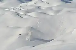 The use of avalanche cords goes back to the early 20th century and a Bavarian mountaineer named Eugen Oertel. In the United States the concept was recommended as early as 1908 in the Colorado newspaper - the Ouray Herald (November 13) - when the editor repeated the suggestion that miners in the San Juan Mountains adopt "snowslide ribbons" to safeguard their travels to and from the mines.[3] The principle is simple. An approximately 15 metre long red cord (similar to parachute cord) is attached to the belt of the person to be protected. While they are skiing, snowboarding, or walking, the cord is dragged along behind them. The intent is, that if the person gets buried in an avalanche, the light cord stays on top of the snow. Due to the colour the cord would be easily visible for companions. Commercial avalanche cords have metal markings every one to three metres indicating the direction and length to the victim.