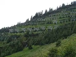 Artificial barriers can be very effective in reducing avalanche damage. There are several types. One kind of barrier (snow net) uses a net strung between poles that are anchored by guy wires in addition to their foundations. These barriers are similar to those used for rockslides. Another type of barrier is a rigid fence like structure (snow fence) and may be constructed of steel, wood or pre-stressed concrete. They usually have gaps between the beams and are built perpendicular to the slope, with reinforcing beams on the downhill side. Rigid barriers are often considered unsightly, especially when many rows must be built. They are also expensive and vulnerable to damage from falling rocks in the warmer months. Finally, there are barriers that stop or deflect avalanches with their weight and strength. These barriers are made of concrete, rocks or earth. They are usually placed right above the structure, road or railway that they are trying to protect, although they can also be used to channel avalanches into other barriers. Occasionally, earth mounds are placed in the avalanche's path to slow it down.