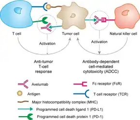 Avelumab is a whole monoclonal antibody of isotype IgG1 that binds to the programmed death-ligand 1 (PD-L1) and therefore inhibits binding to its receptor programmed cell death 1 (PD-1). Formation of a PD-1/PD-L1 receptor/ligand complex leads to inhibition of CD8+ T cells, and therefore inhibition of an immune reaction. Immunotherapy aims at ceasing this immune blockage by blocking those receptor ligand pairs. In the case of avelumab, the formation of PD-1/PDL1 ligand pairs is blocked and CD8+ T cell immune response should be increased. PD-1 itself has also been a target for immunotherapy.[14]