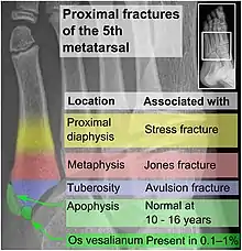 The tuberosity avulsion fracture (also known as pseudo-Jones fracture or dancer's fracture[2] is a common fracture of the fifth metatarsal (the bone on the outside edge of the foot extending to the little toe).[3] This fracture is likely caused by the lateral band of the plantar aponeurosis (tendon).[4]
