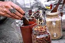The vast majority (90%) of ayurvedic remedies are plant based.[59] Plant-based treatments in ayurveda may be derived from roots, leaves, fruits, bark, or seeds; some examples of plant-based substances include cardamom and cinnamon. In the 19th century, William Dymock and co-authors summarized hundreds of plant-derived medicines along with the uses, microscopic structure, chemical composition, toxicology, prevalent myths and stories, and relation to commerce in British India.[60] Triphala, an herbal formulation of three fruits, Amalaki, Bibhitaki, and Haritaki, is one of the most commonly used[61] Ayurvedic remedies.[62][63] The herbs Withania somnifera (Ashwagandha)[64] and Ocimum tenuiflorum (Tulsi)[59] are also routinely used in ayurveda.