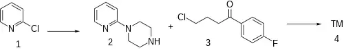 The alkylation of 2-chloropyridine (1) with piperazine gives 1-(pyridin-2-yl)piperazine [67980-77-2] (2). The attachement of the sidechain by reaction with 4-chloro-4'-fluorobutyrophenone [3874-54-2] (3) completed the synthesis of azaperone (4).