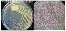 Colonial morphology (left) and microscopic morphology (x100; right) | |