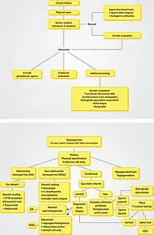 - 1 2 3 4 5 6 7 Jarvi, K; Lo, K; Fischer, A; Grantmyre, J; Zini, A; Chow, V; Mak, V (2010). "CUA Guideline: The workup of azoospermic males". Canadian Urological Association Journal. 4 (3): 163–7. doi:10.5489/cuaj.10050. PMC 2874589. PMID 20514278.
