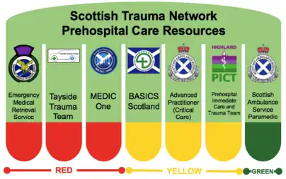 BASICS Scotland is an association of health care professionals, who undertake additional training as immediate care practitioners.[2] The members provide their services in support of the statutory or voluntary ambulance services.[15][16] These responders form part of the pre-hospital elements of the Scottish Trauma Network, in relation to this, they are considered Yellow Level responders, in relation to their scope of practice. BASICS Scotland in coordination with the Sandpiper Trust is also a keen promoter of first aid and emergency prehospital care.[17]