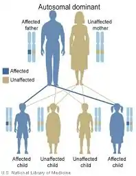 For each child an affected parent has, there is a 50% chance of passing on the mutation, regardless of the sex of the child autosomal dominant | |