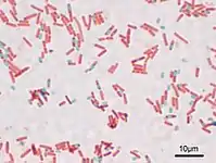 Bacillus subtilis is a Gram-positive bacterium, rod-shaped and catalase-positive. It was originally named Vibrio subtilis by Christian Gottfried Ehrenberg,[7] and renamed Bacillus subtilis by Ferdinand Cohn in 1872[8] (subtilis being the Latin for "fine, thin, slender"). B. subtilis cells are typically rod-shaped, and are about 4–10 micrometers (μm) long and 0.25–1.0 μm in diameter, with a cell volume of about 4.6 fL at stationary phase.[4][9]