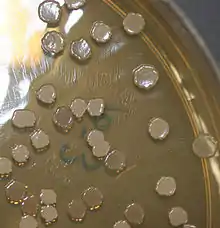Colonies of B. subtilis grown on a culture dish in a molecular biology laboratory.