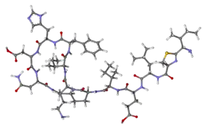 • CCC(C)C(N)NC4=NC(C(=O)N[C@@H](CC(C)C)C(=O)N[C@H](CCC(O)=O)C(=O)N[C@@H](C(C)CC)C(=O)N[C@H]3CCCCNC(=O)[C@H](CC(N)=O)NC(=O)[C@@H](CC(O)=O)NC(=O)[C@H](Cc1cnc[nH]1)NC(=O)[C@@H](Cc2ccccc2)NC(=O)[C@H](C(C)CC)NC(=O)[C@@H](CCCN)NC3=O)CS4