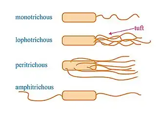 Different types of cell flagellation are found depending on the number and arrangement of the flagella on the cell surface, e.g., only at the cell poles or spread over the cell surface.[23] In polar flagellation, the flagella are present at one or both ends of the cell: if a single flagellum is attached at one pole, the cell is called monotrichous; if a tuft of flagella is located at one pole, the cells is lophotrichous; when flagella are present at both ends, the cell is amphitrichous. In peritrichous flagellation, the flagella are distributed in different locations around the cell surface. Nevertheless, variations within this classification can be found, like lateral and subpolar—instead of polar—monotrichous and lophotrichous flagellation.[24][3]