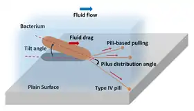 A bacterial biofilm is a bacterial community attached into a surface through extracellular polymeric materials.[71] Prior to biofilm formation, bacteria may need to deposit on the surface from their planktonic state. After bacteria deposit on surfaces they may "twitch" or crawl over the surface using appendages called type IV pili to "explore" the substratum to find suitable sites for growth and thus biofilm formation.[72][73][74][75] Pili emanate from bacterial surface and they can be up to several micrometres long (though they are nanometres in diameter).[76] Bacterial twitching occurs through cycles of polymerization and depolymerization of type IV pili.[77][78] Polymerization causes the pilus to elongate and eventually attaching into surfaces. Depolymerization makes the pilus retract and detach from the surfaces. Pili retraction produces pulling forces on the bacterium, which will be pulled in the direction of the vector sum of the pili forces, resulting in a jerky movement. A typical type IV pilus can produce a force exceeding 100 piconewtons [79] and then a bundle of pili can produce pulling forces up to several nanonewtons.[80] Bacteria may use pili not only for twitching but also for cell-cell interactions,[81][82] surface sensing,[83][84] and DNA uptake.[85][67]