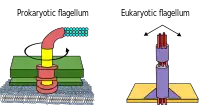 Some eukaryotic cells also use flagella — and they can be found in some protists and plants as well as animal cells. Eukaryotic flagella are complex cellular projections that lash back and forth, rather than in a circular motion. Prokaryotic flagella use a rotary motor, and the eukaryotic flagella use a complex sliding filament system. Eukaryotic flagella are ATP-driven, while prokaryotic flagella can be ATP-driven (archaea) or proton-driven (bacteria).[22]