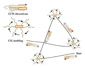 The archetype of bacterial swimming is represented by the well-studied model organism Escherichia coli.[3] With its peritrichous flagellation, E. coli performs a run-and-tumble swimming pattern, as shown in the diagram on the right. CCW rotation of the flagellar motors leads to flagellar bundle formation that pushes the cell in a forward run, parallel to the long axis of the cell. CW rotation disassembles the bundle and the cell rotates randomly (tumbling). After the tumbling event, straight swimming is recovered in a new direction.[53] That is, CCW rotation results in steady motion and CW rotation in tumbling; CCW rotation in a given direction is maintained longer in the presence of molecules of interest (like sugars or aminoacids).[53][3]