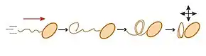 Cell trajectories and flagellar motion during swarming was thoroughly studied for E. coli, in combination with fluorescently labeled flagella.[66][46] The authors described four different types of tracks during bacterial swarming: forward movement, reversals, lateral movement, and stalls.[46] In forward movement, the long axis of the cell, the flagellar bundle and the direction of movement are aligned, and propulsion is similar to the propulsion of a freely swimming cell. In a reversal, the flagellar bundle loosens, with the filaments in the bundle changing from their "normal form" (left-handed helices) into a "curly" form of right-handed helices with lower pitch and amplitude. Without changing its orientation, the cell body moves backwards through the loosened bundle. The bundle re-forms from curly filaments on the opposite pole of the cell body, and the filaments eventually relax back into their normal form. Lateral motion can be caused by collisions with other cells or by a motor reversal. Finally, stalled cells are paused but the flagella continue spinning and pumping fluid in front of the swarm, usually at the swarm edge.[46][3]