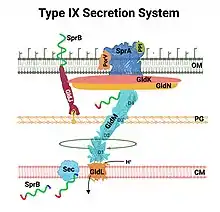 - ↑ Veith PD, Glew MD, Gorasia DG, Reynolds EC (October 2017). "Type IX secretion: the generation of bacterial cell surface coatings involved in virulence, gliding motility and the degradation of complex biopolymers". Molecular Microbiology. 106 (1): 35–53. doi:10.1111/mmi.13752. hdl:11343/208056. PMID 28714554. S2CID 19387266.