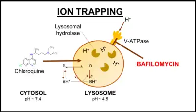 When one of these drugs is co-applied to cells with bafilomycin A1, the action of bafilomycin A1 prevents the acidification of the lysosome, therefore preventing the phenomenon of ion trapping in this compartment.[29] As the lysosome cannot acidify, lysosomotropic drugs do not become protonated and subsequently trapped in the lysosome in the presence of bafilomycin. Additionally, when cells are preloaded with lysosomotropic drugs in vitro, then treated with bafilomycin, bafilomycin acts to release the cationic compound from its accumulation in the lysosome.[21]