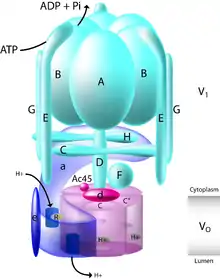 In order to move protons across the membrane, a proton first enters subunit a within the Vo domain through a cytoplasmic hemichannel. This allows conserved glutamic acid residues within the proteolipid ring of Vo subunits c and c" to become protonated. Adenosine triphosphate (ATP) is then hydrolyzed by the V1 domain of the enzyme, enabling both the rotation of the central stalk of the pump, made up of subunits D, F and d, and the rotation of the proteolipid ring. This rotation puts the protonated glutamic acid residues in contact with a luminal hemichannel located in subunit a. Within subunit a, arginine residues serve to stabilize the deprotonated form of glutamic acid and allow the release of their protons. This rotation and proton transfer brings the protons through the pump and across the membrane.[3][15]
