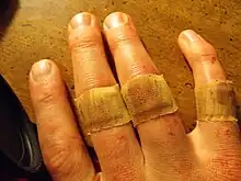 A bandage is a piece of material used either to support a medical device such as a dressing or splint, or on its own to provide support for the movement of a part of the body. When used with a dressing, the dressing is applied directly on a wound, and a bandage used to hold the dressing in place. Other bandages are used without dressings, such as elastic bandages that are used to reduce swelling or provide support to a sprained ankle. Tight bandages can be used to slow blood flow to an extremity, such as when a leg or arm is bleeding heavily.