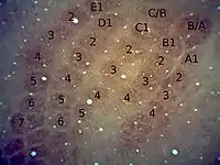 The barrels that correspond to the major facial whiskers (mystacial vibrissae) are contained within the posteromedial barrel subfield (PMBSF). The barrels here are the largest and most elliptical in shape and have a striking topographical organization that is identical to that of the whiskers; they are organized into 5 rows of 4-7 large whiskers that run close to parallel with the bridge of the nose.[6] The organisation of the mystacial vibrissae and corresponding barrels is so consistent that there is a naming convention to identify each whisker in rats and mice. Rows are designated A to E from top to bottom, and columns of whiskers within each row are numbered from back to front. The first four rows also have an additional whisker behind column 1, which is designated with a lower case letter or a Greek letter (α, β, γ, or δ). These four whiskers are also called straddlers.