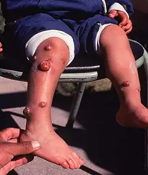 The chronic manifestation consists of a benign skin eruption with raised, reddish-purple nodules (angiomatous tumours). The bacterium can be seen microscopically, if a skin biopsy is silver stained which is the Warthin–Starry method.[12][13]
