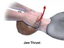 The jaw-thrust maneuver is an effective airway technique, particularly in patients in whom cervical spine injury is a concern. The jaw thrust is a technique used on patients with a suspected or possible cervical spinal cord injury and is used on a supine patient. The practitioner uses their index and middle fingers to physically pull the posterior (back) of the mandible towards the ceiling, while their thumbs open the mouth.[16][17]