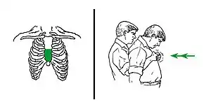 Performing abdominal thrusts involves a rescuer standing behind a patient and using his or her hands to exert pressure on the bottom of the diaphragm. This compresses the lungs and exerts pressure on any object lodged in the trachea, hopefully expelling it. The European Resuscitation Council and the Mayo Clinic recommend alternating between 5 back slaps and 5 abdominal thrusts in severe airway obstructions.[4][5] While UpToDate recommends only using abdominal thrusts in adults and children more than one-year-old.[6] In some areas, such as Australia, authorities believe there is not enough scientific evidence to support the use of abdominal thrusts, and their use is not recommended in first aid. Instead, chest thrusts are recommended.[7] A person may also perform abdominal thrusts on himself by using a fixed object such as a railing or the back of a chair to apply pressure where a rescuer's hands would normally do so. As with other forms of the procedure, internal injuries may result.