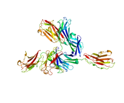 It has a variety of functions. In addition to its metalloproteinase-inducing ability, basigin also regulates several distinct functions, such as spermatogenesis, expression of the monocarboxylate transporter and the responsiveness of lymphocytes.[6] Basigin is a type I integral membrane receptor that has many ligands, including the cyclophilin (CyP) proteins Cyp-A and CyP-B and certain integrins.[12][13][14] Basigin also serves as a receptor for S100A9 and platelet glycoprotein VI, and basigin-1 acts as a receptor for the rod-derived cone viability factor.[9] It is expressed by many cell types, including epithelial cells, endothelial cells, neural progenitor cells[15] and leukocytes. The human basigin protein contains 269 amino acids that form two heavily glycosylated C2 type immunoglobulin-like domains at the N-terminal extracellular portion. A second form of basigin has also been characterized that contains one additional immunoglobulin-like domain in its extracellular portion.[6]