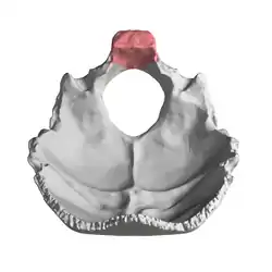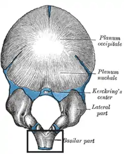 The basilar part of the occipital bone (also basioccipital) extends forward and upward from the foramen magnum, and presents in front an area more or less quadrilateral in outline.