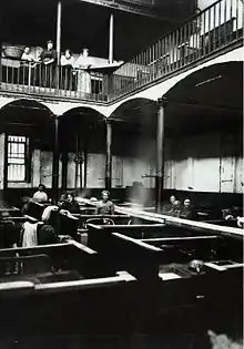 The popularity of wash-houses was spurred by the newspaper interest in Kitty Wilkinson, an Irish immigrant "wife of a labourer" who became known as the Saint of the Slums.[31] In 1832, during a cholera epidemic, Wilkinson took the initiative to offer the use of her house and yard to neighbours to wash their clothes, at a charge of a penny per week,[13] and showed them how to use a chloride of lime (bleach) to get them clean. She was supported by the District Provident Society and William Rathbone. In 1842, Wilkinson was appointed baths superintendent.[32][33]
