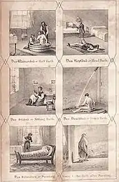 A popular revival followed the application of hydrotherapy around 1829, by Vincenz Priessnitz, a peasant farmer in Gräfenberg, then part of the Austrian Empire.[25] [26] This revival was continued by a Bavarian priest, Sebastian Kneipp (1821–1897), "an able and enthusiastic follower" of Priessnitz, "whose work he took up where Priessnitz left it", after he read a treatise on the cold water cure.[27] In Wörishofen (south Germany), Kneipp developed the systematic and controlled application of hydrotherapy for the support of medical treatment that was delivered only by doctors at that time. Kneipp's own book My Water Cure was published in 1886 with many subsequent editions, and translated into many languages.