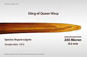 The stinger of a honey bee separated from the body and attached to a protective dressing | |