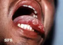 Nearly all people with Behçet's disease present with some form of painful ulcerations inside the mouth.[4] They are a form of aphthous ulcers or non-scarring oral lesions.[4] The oral lesions are similar to those found in inflammatory bowel disease and can be relapsing.[4] Painful genital ulcerations usually develop around the anus, vulva, or scrotum and cause scarring in 75 percent of the patients.[4] Additionally, patients may present with erythema nodosum, cutaneous pustular vasculitis, and lesions similar to pyoderma gangrenosum.[4]