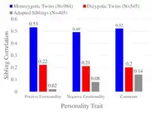 The nature of this environmental influence, however, is such that it tends to make individuals in the same family more different from one another, not more similar to one another.[3] That is, estimates of shared environmental effects () in human studies are small, negligible, or zero for the vast majority of behavioural traits and psychiatric disorders, whereas estimates of non-shared environmental effects () are moderate to large.[11] From twin studies is typically estimated at 0 because the correlation () between monozygotic twins is at least twice the correlation () for dizygotic twins. When using the Falconer variance decomposition () this difference between monozygotic and dizygotic twin similarity results in an estimated . The Falconer decomposition is simplistic.[25] It removes the possible influence of dominance and epistatic effects which, if present, will tend to make monozygotic twins more similar than dizygotic twins and mask the influence of shared environmental effects.[25] This is a limitation of the twin design for estimating . However, the general conclusion that shared environmental effects are negligible does not rest on twin studies alone. Adoption research also fails to find large () components; that is, adoptive parents and their adopted children tend to show much less resemblance to one another than the adopted child and his or her non-rearing biological parent.[3] In studies of adoptive families with at least one biological child and one adopted child, the sibling resemblance also tends to be nearly zero for most traits that have been studied.[11][60]