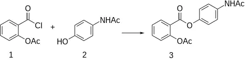 Acetyl salicoyl chloride (1) is reacted with paracetamol (2) to give benorilate (3).[2][3][4][5]