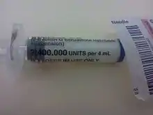 Benzathine benzylpenicillin, also known as benzathine penicillin G, is an antibiotic useful for the treatment of a number of bacterial infections.[3] Specifically it is used to treat strep throat, diphtheria, syphilis, and yaws.[5][3] It is also used to prevent rheumatic fever.[5] It is given by injection into a muscle.[5]