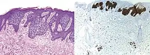 Comparison H&E stain (left) with BerEP4 immunohistochemistry staining (right) on a pathological section having BCC with squamous cell metaplasia. Only BCC cells are stained with BerEP4.[1]
