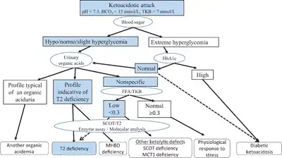Beta-ketothiolase deficiency is a rare, autosomal recessive metabolic disorder in which the body cannot properly process the amino acid isoleucine or the products of lipid breakdown.[1][2] Along with SCOT deficiency, it belongs to a group of disorders called ketone utilisation disorders.