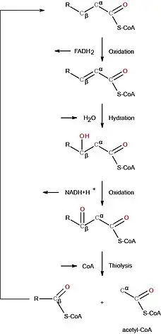 Once inside the mitochondria, each cycle of β-oxidation, liberating a two carbon unit (acetyl-CoA), occurs in a sequence of four reactions:[3]