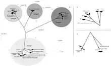 Within the genus Betacoronavirus (Group 2 CoV), four subgenera or lineages (A, B, C, and D) have traditionally been recognized.[5] The four lineages have also been named using Greek letters or numerically.[9] A fifth subgenus, Hibecovirus, was added more recently.[16] Member subgenera and species include:[17]