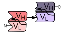 Structure of a BiTE. VH: Heavy chain variable regions. VL: Light chain variable regions. Different specificity is marked with different colours and shapes. The arrows point from N- to C-terminus.