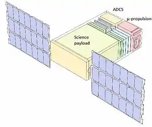 Of the total 6 Units volume, 4 Units will hold the science payload, including a radiation dosimeter and a dedicated 3-color spectrometer for each well; 0.5U will house the ADCS (Attitude Determination and Control Subsystem), 0.5U will house the EPS (Electrical Power System) and C&DH (Command and Data Handling) avionics, and 1U will house the attitude control thruster assembly, which will be 3D printed all in one piece: cold gas (DuPont R236fa) propellant tanks, lines and seven nozzles. The use of 3D printing also allows the optimization of space for increased propellant storage (165 grams [8]).[12] The thrust of each nozzle is 50 mN, and a specific impulse of 31 seconds.[12] The attitude control system is being developed and fabricated by the Georgia Institute of Technology.